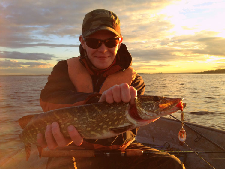 Но попробовать хотелось. Напарник стал ловить воблерами, а я не стал изобретать велосипед и взялся за вертушки. Я привык начинать рыбалку именно с них – по активной рыбе блёсны часто показывают наилучшие результаты. К счастью, уже совсем скоро стало понятно, что рыба в месте ловли есть и не прочь перекусить. За вечер нами было поймано 5 упитанных щук до полутора килограмма весом. Примечательно, что вся рыба была поймана именно на вращающиеся блёсны – по всей видимости, в тех условиях воблеры оказались не к месту. Мой напарник, весь вечер упиравшийся в пластиковые приманки, в конце концов, взял мою снасть чтобы сделать несколько забросов и получил на первой же проводке удар «полуторакилошки».