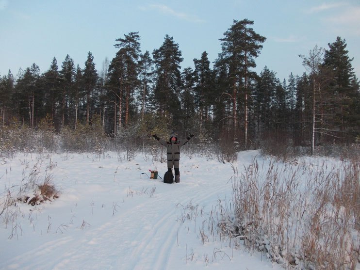 Наконец-то вроде дождались, придавили морозики. хоть и небольшие, но постоянные. А как со льдом? На любимой Ладоге постоянные ветра всё не дают образоватся ледовому покрову, посему поначалу решили первые выходы делать на лёд небольших лесных озёр. Первый выезд совершили на небольшое озерцо неподалёку от города. Озеро встретило настоящей зимней погодкой.