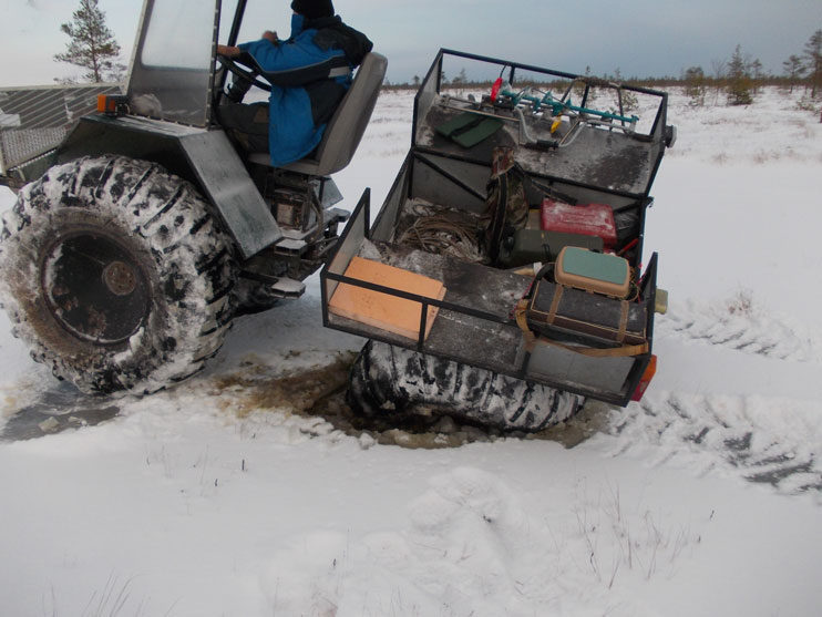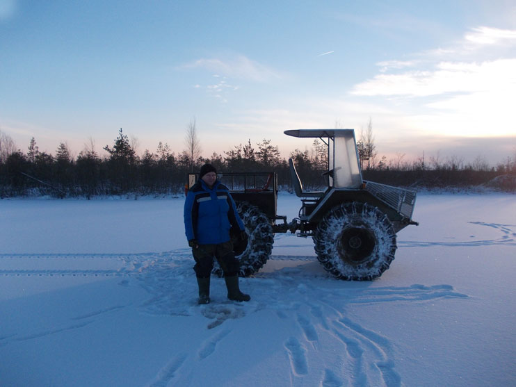 Путь по непромёрзшему как следует болоту оказался нескорым. "Трахтур" наш даже проваливался в трясину. Но техника плавающая, так что, хоть и долго и с приключениями, но добрались-таки до озера.