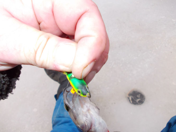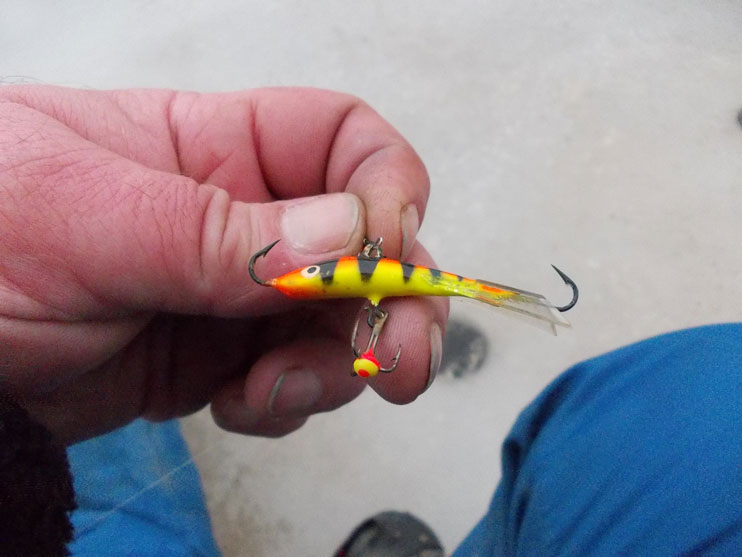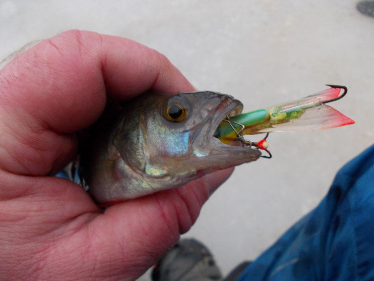 Надо поставить что-то помельче. Открываю "кошелёк" с приманками, взгляд зацепляется за трёхсантиметровый "Хоппер". Тоже в прошлые зимы не раз хорошо срабатывал по прибрежным окунёчкам. Стоило только опустить его, пару раз качнуть - окунь оценил. Достаю полосатика из лунки.