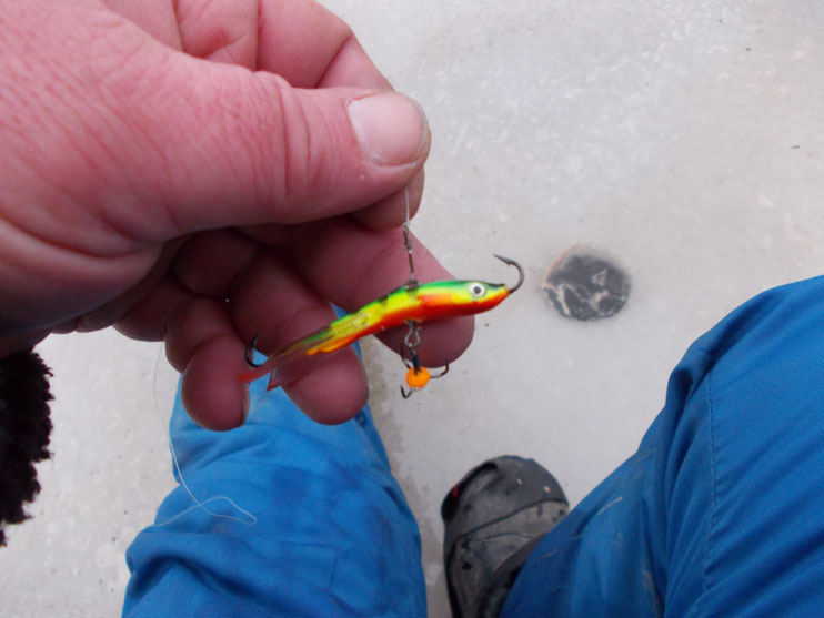Однако окушок оказывается другого мнения. Пара лунок проверенных этим балансиром не приносят ни тычка. Меняю приманку - ставлю не раз выручавший балансир "Аква Чудо 5" зелёно-окунёвого цвета.