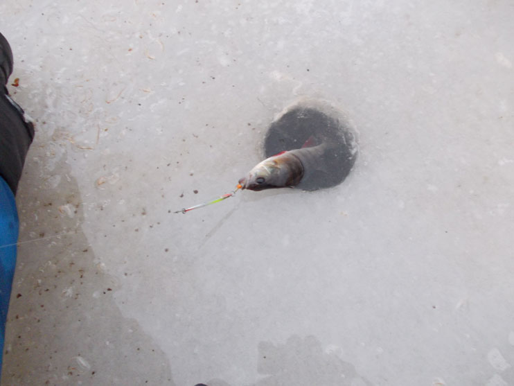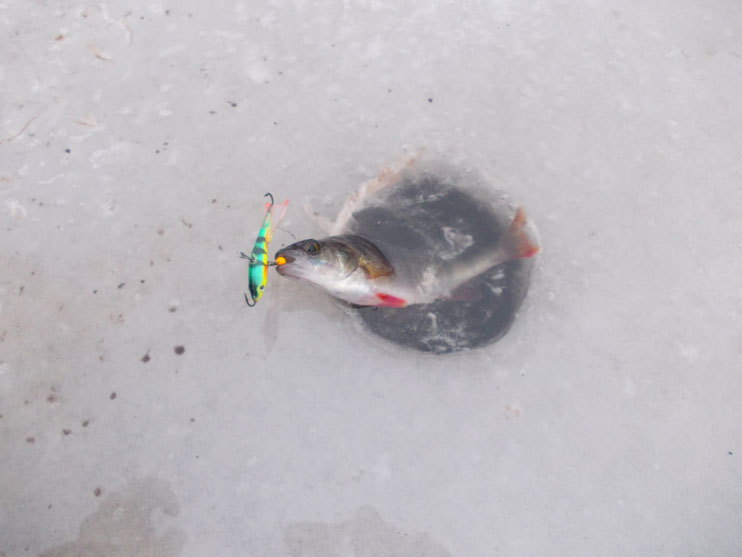 Потом следует такой же неспешный ступенчатый спуск приманки ко дну. На одной из пауз - тычок, подсечка и очередной окунишка вылезает из круглого окошечка во льду.