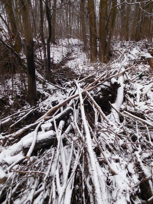 Рядом с ручьем, плюс ко всему, интересный рельеф, стоит сделать пару шагов от берега, как тут же можно угодить в резкий свал, недаром здесь летом стоял белый буй. Тема подходить к ручью категорически отказался, повернул обратно, пришлось обследовать самому.