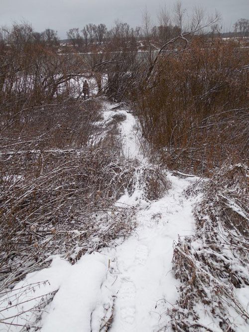 С горки нам виднелась открытая вода, Тёма встрепенулся, призвав меня поворачивать обратно за снастями для открытой воды. Но я настоял на том, чтобы подойти поближе, возможно, не все так плохо, как кажется издалека. Двоих уговорить идти дальше не удалось ни под каким предлогом.