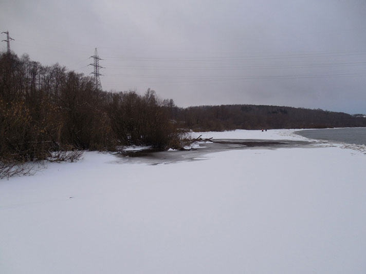 Около часа клев отсутствовал, успели перекусить. Рядом с нами втекал в Оку незамерзающий ручей, который нам сегодня уже встречался на пути, лед рядом с ним ненадежный, но именно к таким местам и тяготеет рыба в глухозимье в поисках кислорода при полном покрытии водоема льдом и почти метровой толщиной льда. А как же сейчас?