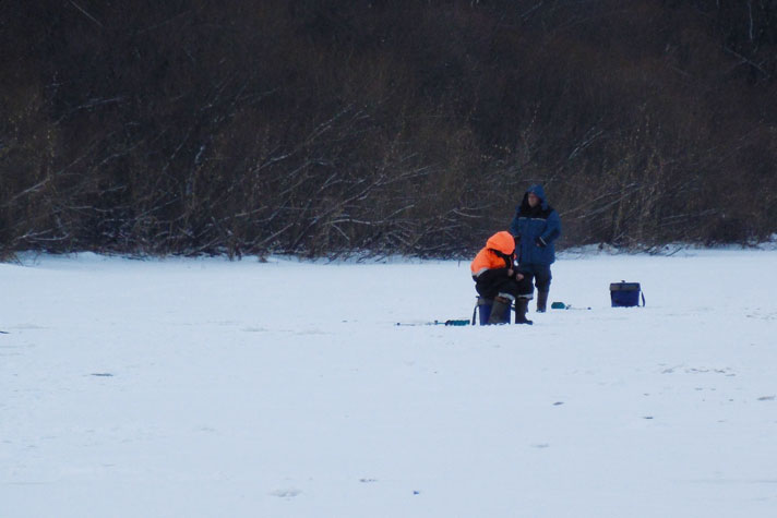Подойдя максимально безопасно к месту впадения ручья в реку, мы пробурили пару лунок и наконец-то разглядели, что сегодня мы не одни на водоеме.
