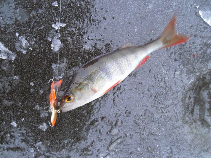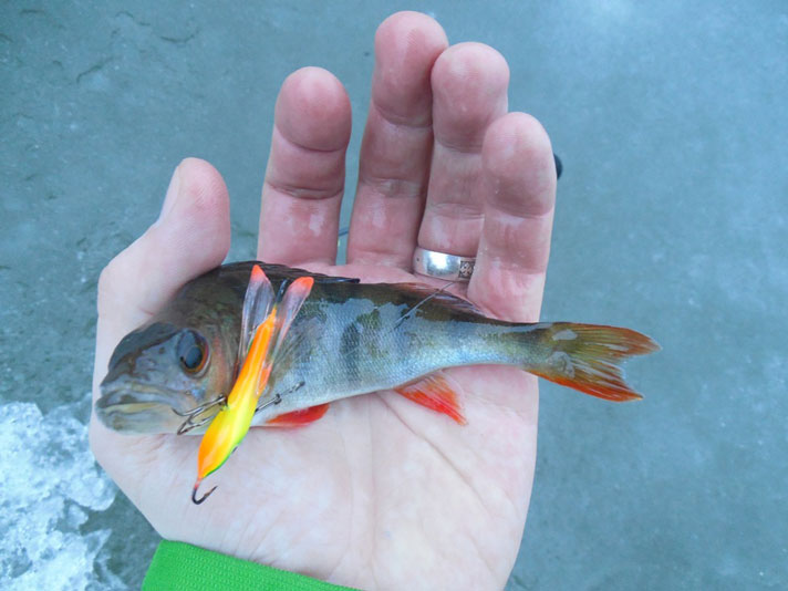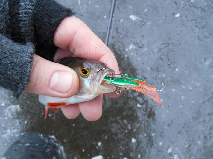 «В глухозимье и ерш рыба!» - кричит Тёма, тягая на балансир уже окуней покрупнее. Когда я пробурил лунку рядом с товарищем, на 4 метрах, окунь сразу заприметил и мою приманку, но до лунки не дошел, сошел. Следующую рыбку, судака, я уже не упустил.
