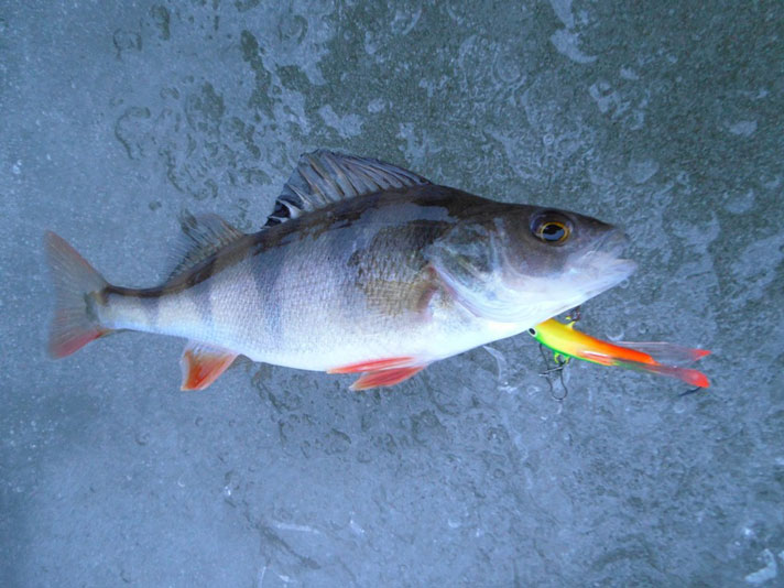 После очередного взмаха удильником выждал паузу, балансир практически перестал раскачиваться, еще пару секунд, и я бы снова заставил балансир кружить восьмерки, но кивок резко дернулся вниз, и я подсек клыкастого. Небольшой совсем, но всё равно приятно, для души.
