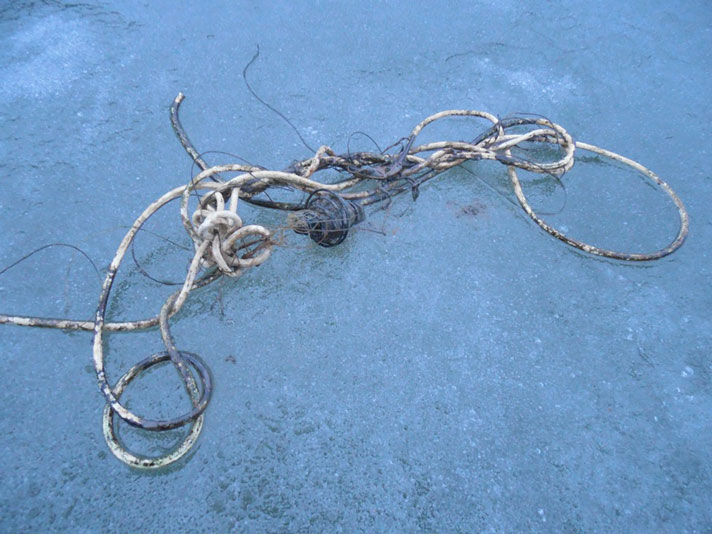 Тема кричит, слова издалека не разбираю, но вижу, что тянет кого то из лунки с натягом, ну, думаю, багор просит. Подбегаю - оказывается, обычный зацеп. Нацепив грузик с тройником, я быстро высвободил приманку и вытащил из воды резинку с кормушкой оставленную многотысячными доночниками, которые захватывают весь водоем практически на все лето.