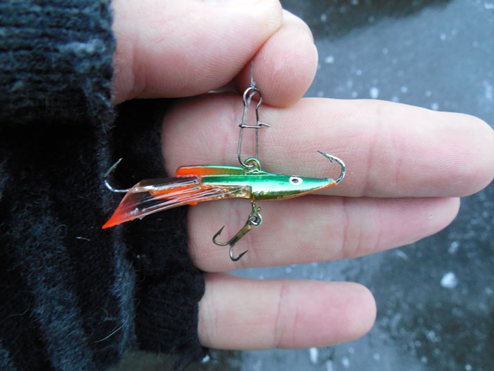 На удильнике стоит зимняя не покрывающаяся льдом плетеная леска AQUA Brilliant с универсальным для меня диаметром 0.14 мм. Уже не первый сезон ей ловлю, не сменяя. Очень редко, когда использую длинные балансиры, мне удобнее анимировать совсем небольшими. Сегодня тоже не стал изменять вкусам и оставил висеть на застежке Aqua Hopper длинной менее пяти сантиметров красно-белой расцветки.