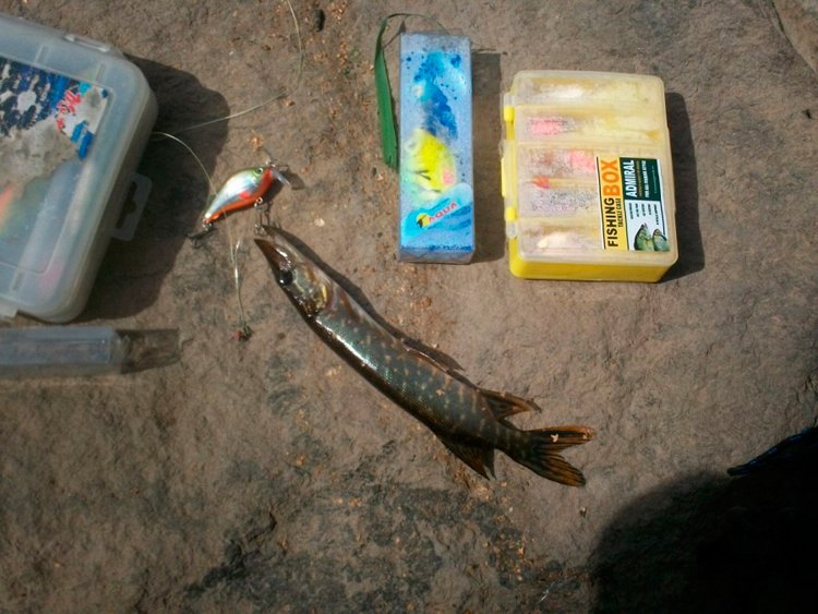 спугиваю щучку побольше. От берега неплохая кильватерная волна за ней пошла. Швыряю ей вслед "карася", раз, другой, третий... Не желает брать привередливая зубастая. Нужно менять приманку! Порывшись в коробочках ставлю самый маленький из имеющихся с собой воблерочков - "Бит". Эта кроха на удивление неплохо забрасывается! А игра такая живая - даже в руку дрожь воблера отдаётся, не ожидал от такой мелюзги! И со второго заброса щучка не выдержала - схватила-таки крохотулю-воблер!Такая бойкая оказалась! За 3-4 минуты вываживания выдала штук 5 свечек. Но в конце концов сдалась: