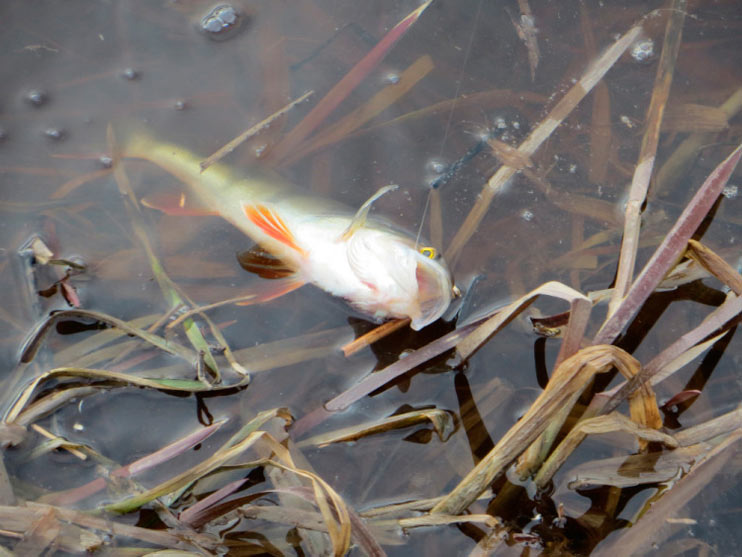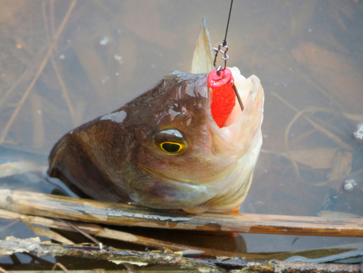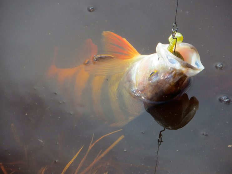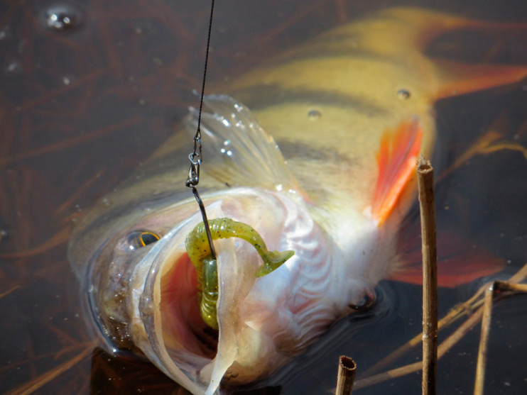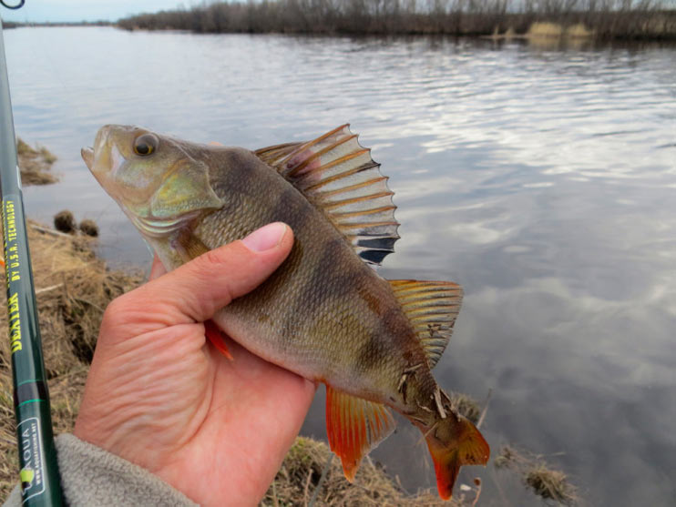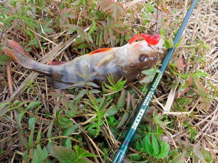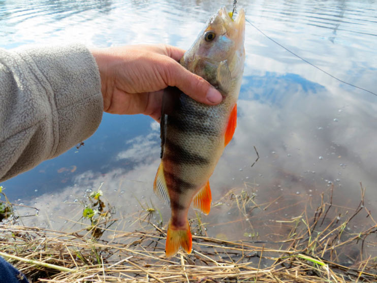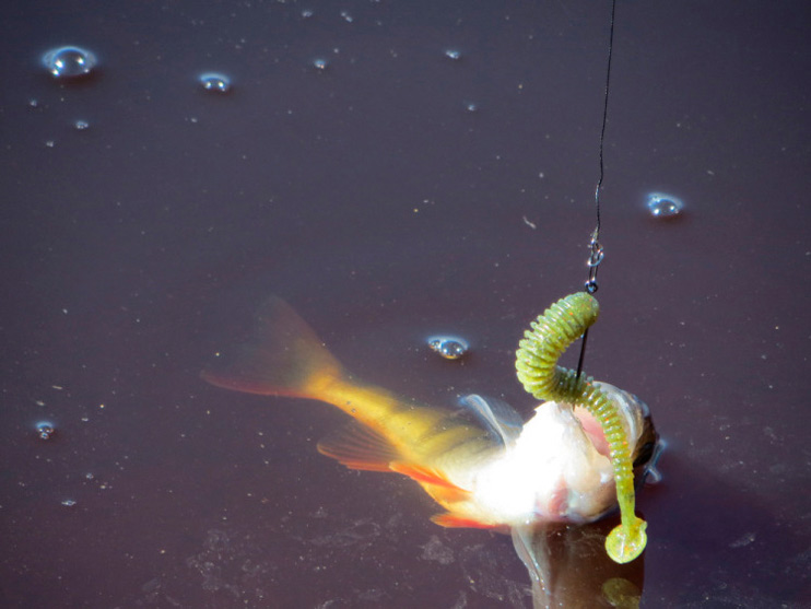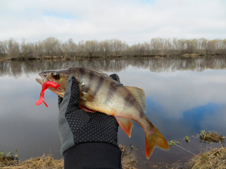 Перехожу к излучине реки, где течение поспокойнее. Кочки травы далеко уходят от берега, образуя естественный залив. Заброс. Груз хорошо чувствует дно, его уже не сносит течение в сторону. Использую «ленивую» проводку. Рыбка перестала клевать, может медленно ползущий красный виброхвост раздразнит «соней».У берега легкий тычок. Подсечка. Сопротивления практически нет. Окунь легко выводится на поверхность.