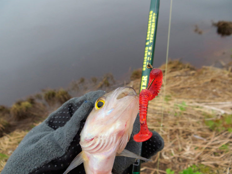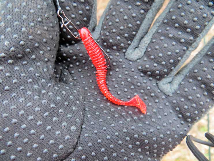 Дня через три задул юго-восток и ранним утром рыбак снова на месте. Уборка мусора на полянке придала радостное возбуждение, которое не смогло погасить даже хмурое облачное утро.Расчехляю спиннинг, плотно со смаком встают друг в друга два колена легкой палочки, щелк, почему, может от службы остался в мыслях звук, присоединилась катушка. Нитка 0.18 проскользнула меж кольцами, завязалась узлом с почти полутора метровым отводным поводком из лесы 0.18 и кончиком 30-ти сантиметровой нити, идущей на 11-ти граммовое грузило. Снасть готова. Первый заброс. Медленная проводка. Кончик спина ласково обстукивает кромки, легко дребезжит по начинающей прорастать подводной растительности, замирает на ровных участках. Легкая поклёва, тишина. Ладно, темновато. Меняю зеленоватый виброхвост на красный твистер. При том не надеваю его на крючок, просто подцепляю за головку. Приманка маленькая. Так лучше будет играть.