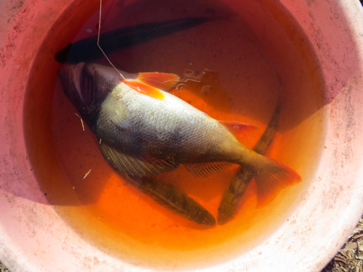 В тазике окушкам приходится подвинуться, место то для трофея маловато