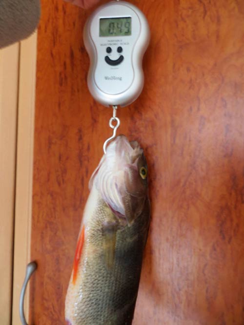 Дома, делаю контрольный замер. 490 грамм весит трофейный окунек, и это сразу после нереста! Хорош бродяга