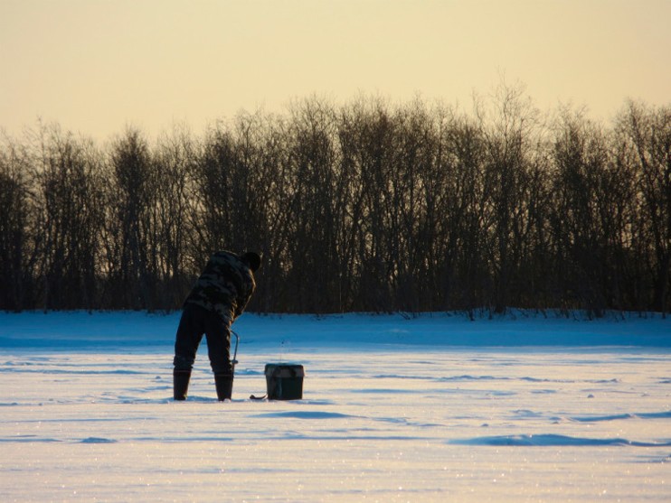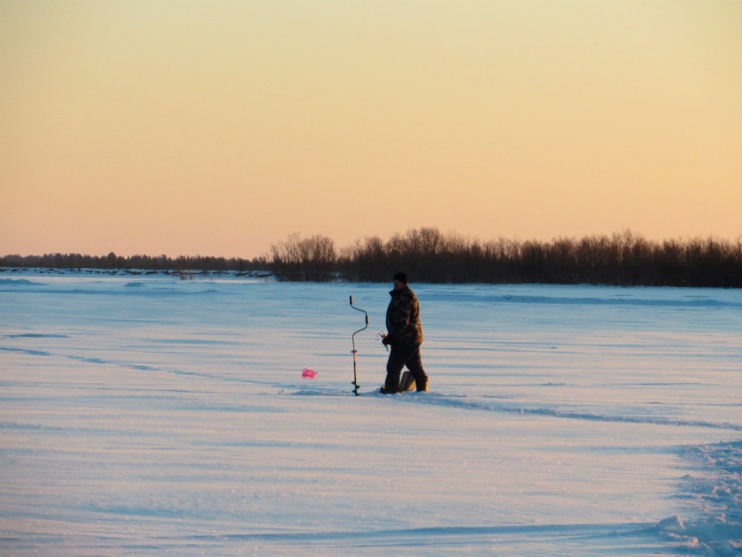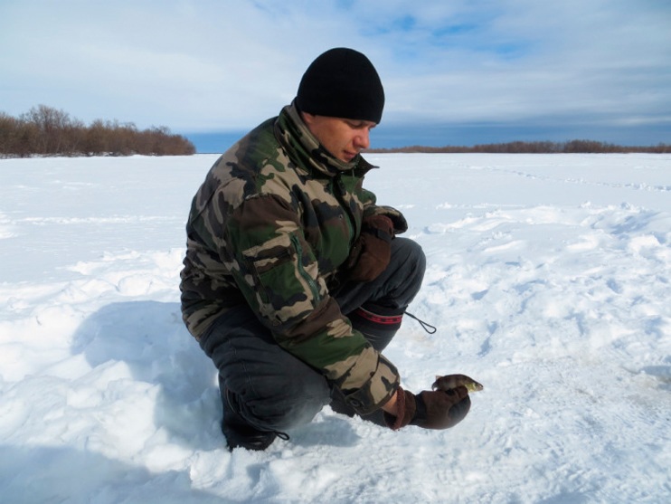 Михаил отошел в сторонку, чтобы проверить рядом места с коряжкой. По прошлому разу в других лунках окунек приличный проявился.