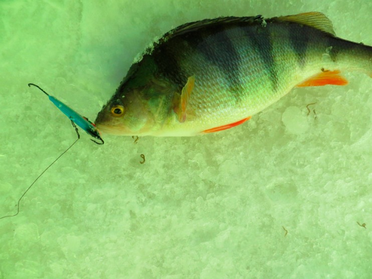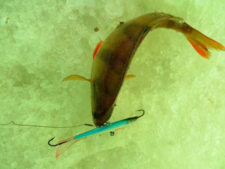 Балансиры крупные в сей раз снарядил. Хочется здоровенного окуша иль может щучину трофейну зацепить. Желание всегда с большими глазами гуляет. Долго, ли коротко воду поласкал, однако пришлось попробовать на приманку сантиметров пять. И тут же уверенный тычок. Первый окунишка пожаловал.