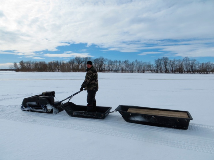 Успеем ли до восхода солнца добраться до нерпичьих островов. Намедни великолепно ловился окушок. Найденный коряжник до сих пор манит новыми открытиями. Трогаем. Ветерка нет, лишь встречный напор воздуха пощипывает лицо. Плотно надетый капюшон да шарф сверху здорово помогает. Миновали Ластолу краем, по целине через поля и скатились в кутовую. Далее по ней до большой протоки. Здорово по весне. Дельта Двины превращается в бесконечное пересечение дорог, буранок, хочешь по ним, хочешь на мотособаке прямо по целине режь. На широких местах снег уплотнился, чиреет. Буксировщик легко разгоняется больше 20 километров в час. Дальше не зажимаю газульку. Опасно, выкинет из санок на повороте, лишь просмотри. На Мурманском русле размечтался, дай, погляжу, как Михаил справляется со своей девяткой. Ого, почти не отстает, букс же пущенный на свободу соскочил с твердой буранки и чуть накренившись под углом погнал по целине. Меня ж качнуло, и вместо того, чтоб приостановиться, инстинктивно прижимаю газ. Получилось буксировщик налево, меня по инерции прямо. Какой-то момент начал терять равновесие, мелькает мысля, придётся катапультироваться, да приземлиться в чистый снежок на пятую точку. Не-е, ничего, выровнялся. Себе нагоняя дал, что, мол, коли хочешь назад посмотреть, дак скорость сбавить, да и помчался дальше, неугомонный.
