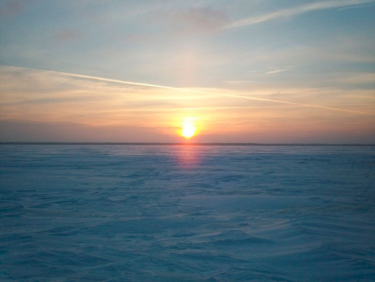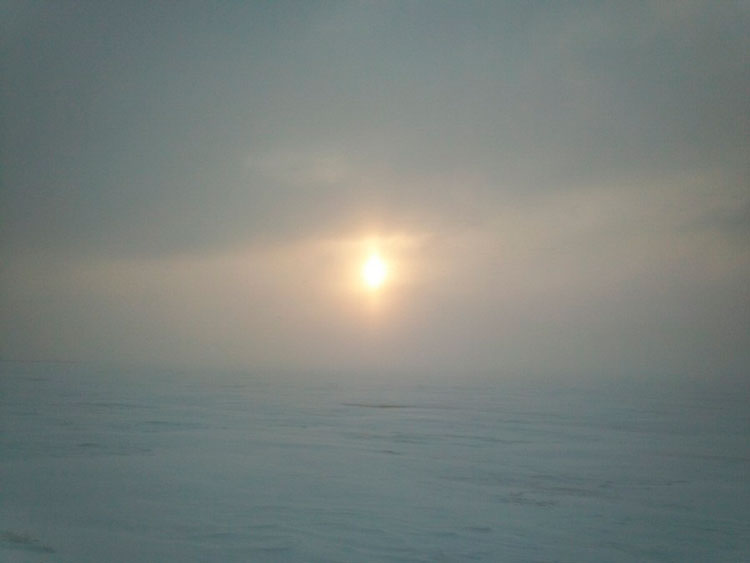 Время - два часа дня. В прошлый выезд как раз ативный клёв начался. Да и погодка поменялась. Мороз всё усиливается, ветер поутих, снега меньше несёт. Солнце во всю силу засияло. Свежий снег сверкает под его лучами, красота!