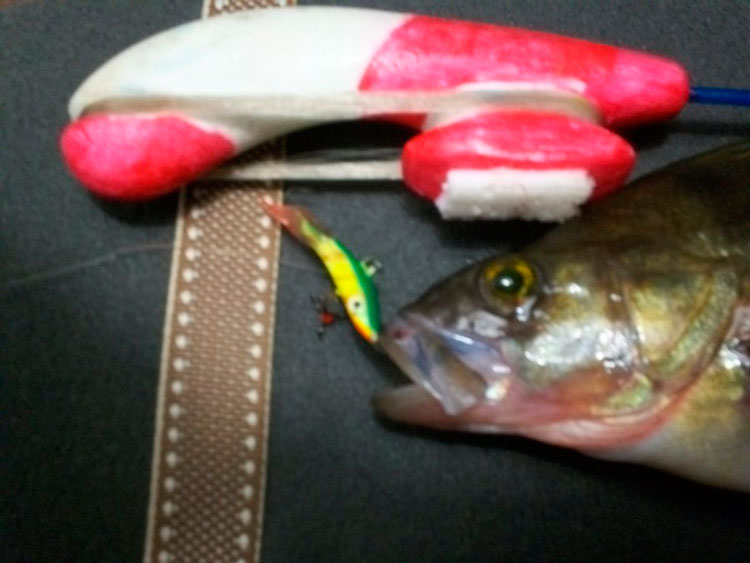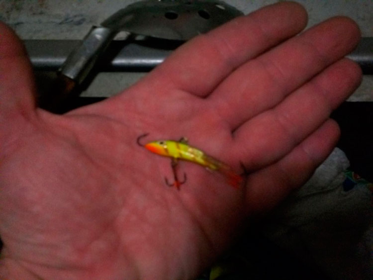 Но только тычки - по одному с каждой свежей лунки. Понятно! Коматозного от слома погоды окушка размер балансира не устраивает. Прицепляю трёхсантиметровый "Хоппер" - в прошлую рыбалку пока хороший клёв не начался, только он и выручил.