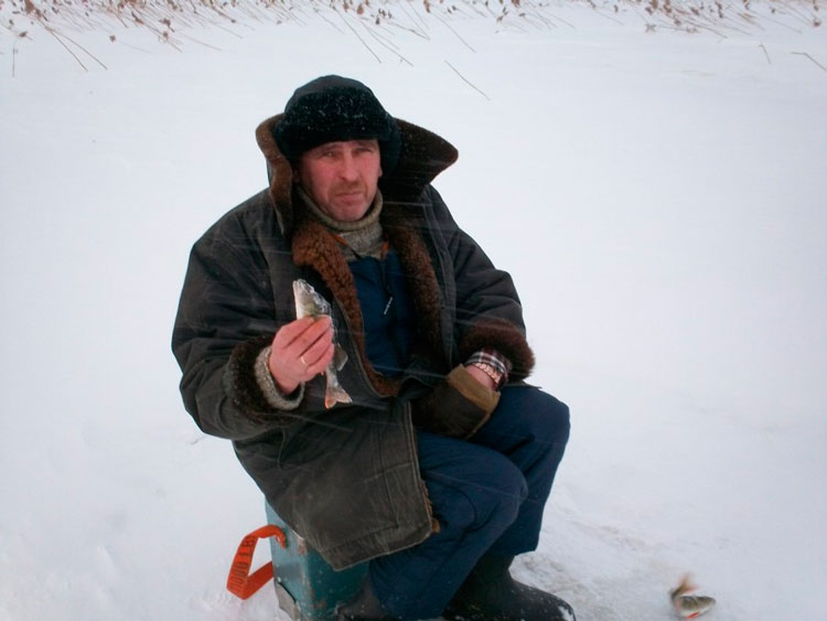 Тут напарник мой зовёт к себе. Нашёл-таки Саня место с более-менее неплохой концентрацией окушка. Тот собрался в небольшом заливчике в стене тростника. Тёзка ловит на мормышку - его такая ловля больше привлекает. А рыбка-то у него попадается!