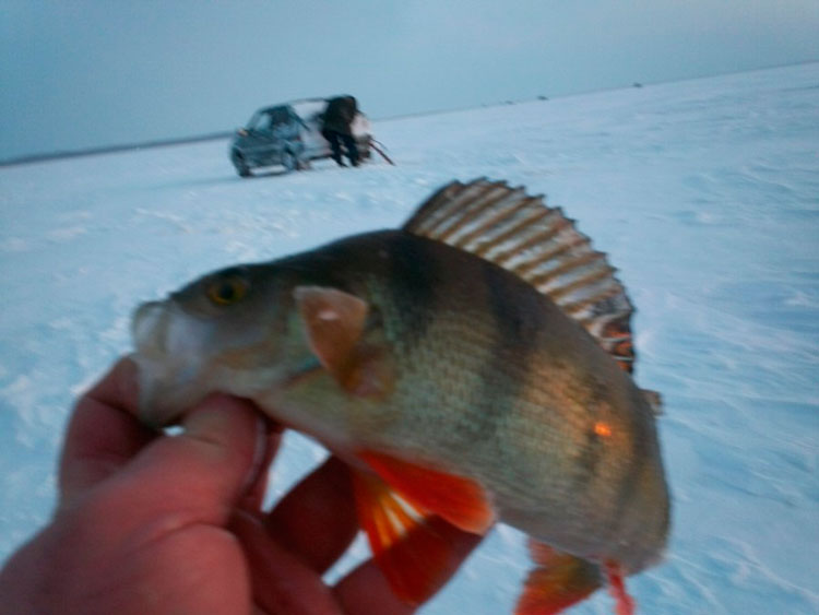 Наконец-то! В следующей лунке окунёвый тычок заканчивается - таки поимкой небольшого окунька. Сразу баланс - обратно в лунку, вдруг ещё попадётся? Пару минут игры ничего не приносят. За это время первенец уже замёрз.
