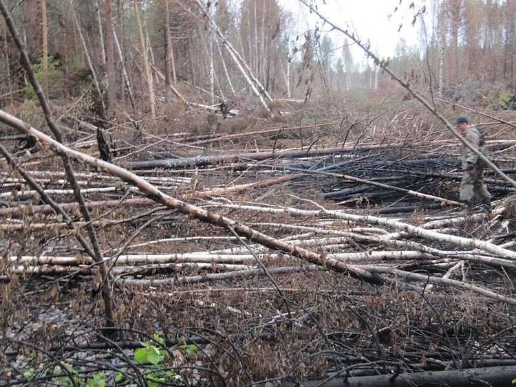 За мостом упавшие молодняки. Корни подгорели. Деревья отчасти погибли, отчасти засыхают. Зрелище не для слабонервных. Отрезанные, отгоревшие корни, как культяпки ног. Жутко.
