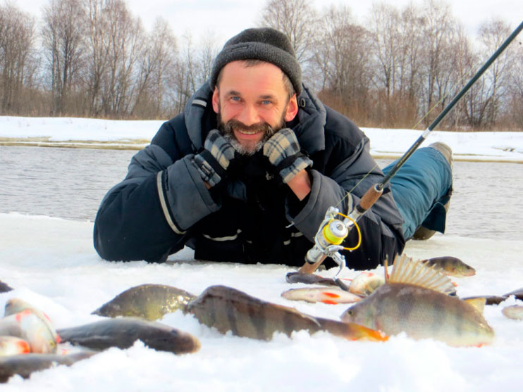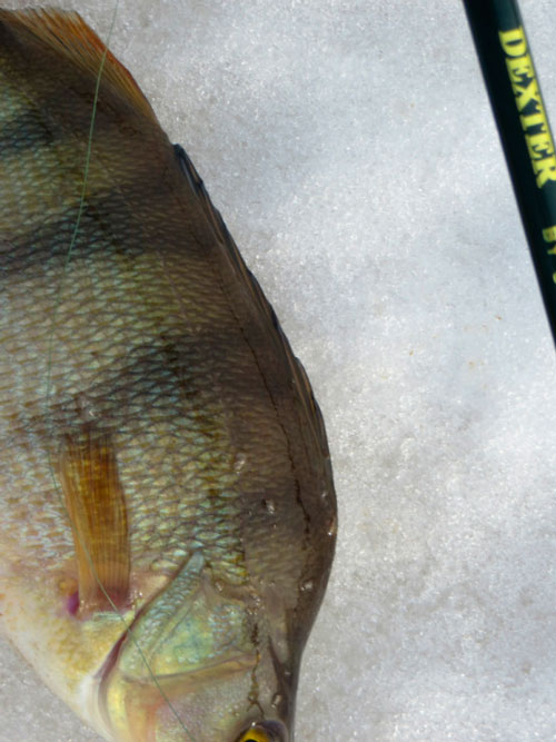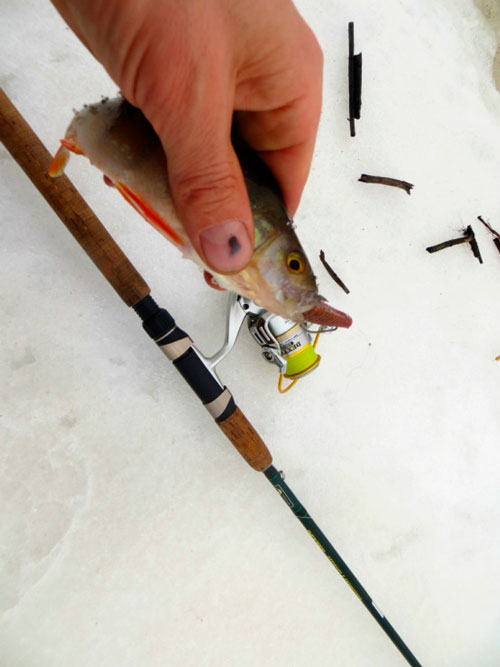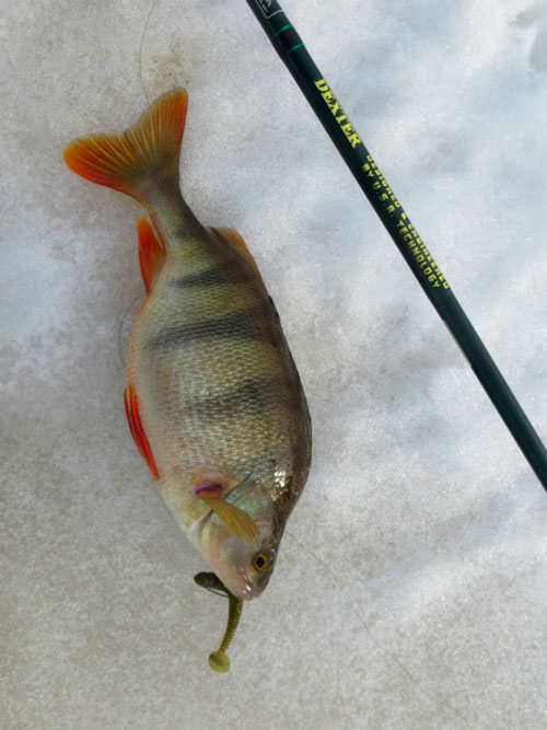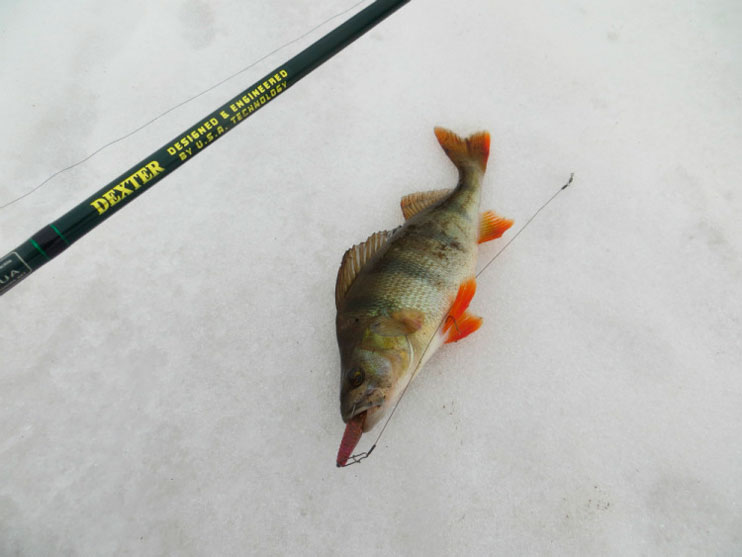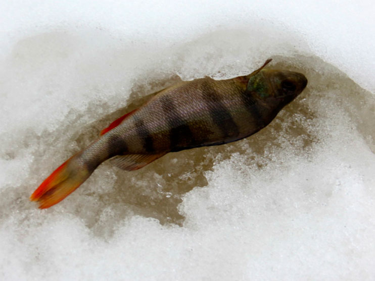 Яркие краски на чистом льду радуют глаз. Окунь расщеперился, поднял плавники, красавец.