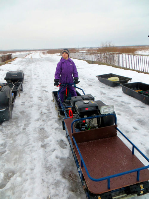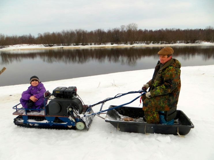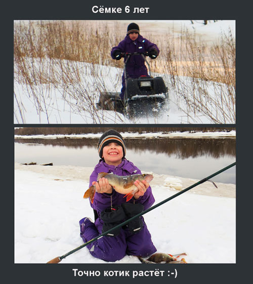 Шучу, кончено, потом заводим буксы и трогаем. Самое интересное место проехать через глубокий приток. Берега обрывистые. Если встаю на лед, то у меня лишь шапку видать. Скатываюсь первым, еле удерживаю равновесие. За мной Семка осторожно подводит букс к краю. Нажимает чуть газ и слетает вниз, поскальзывается, растягивается в волокуше и встает улыбается. Дальше мне предлагаем буксировщик из ручьевины вывести. Что ж, как сынуле не помочь. Он сзади в припрыжку бежит, догоняет. Переехали одни за одним успешно, колонна сформирована, можно трогать. Дальше поляны заросли ивняком, при том толщиной с руку. Некоторые кусты в деревья раскидистые превратились. Постепенно пойменный лес отжимает нас к заберегу. Едем осторожно, чтоб под весом наших поездов льдина не откололась, то придется к Белому морю плыть :-) в местах трещит, останавливаемся, осторожно переводим буксы на противоположную сторону. Благополучно добираемся до ямы. Отдыхаем, чаевничаем. Семе выделяю его любимый пирожок. Приступаем к рыбалке. Странно, поклевки совсем прекратились. Имеем пару зацепов, да обрывов. Настроение ни то - ни сё. Ладно, переезжаем ниже по течению. Километра четыре придется огибать через мост, вновь бить буранку. Ничего за нами не заржавеет. Через полчаса мы уж на новом месте. Рыбаков много, знать, рыбка будет. Семка приступает за строительство рыбо привлекательных сооружений.