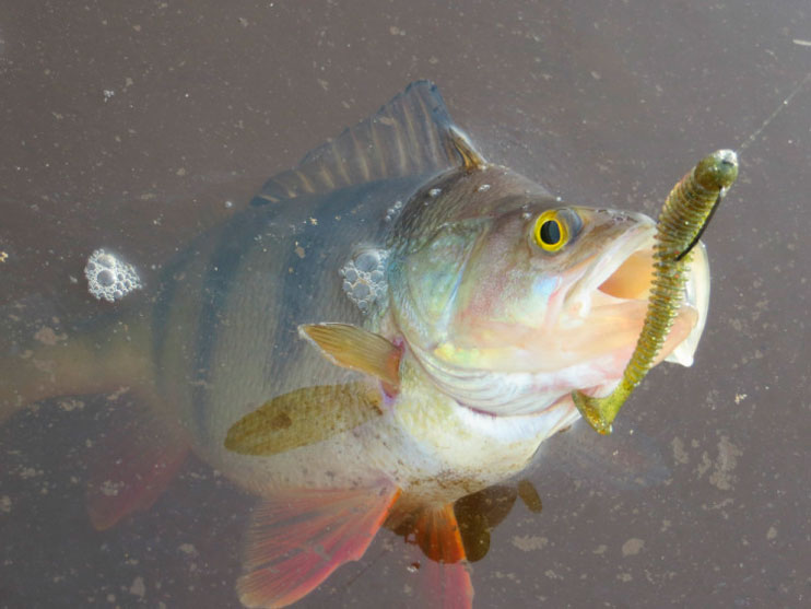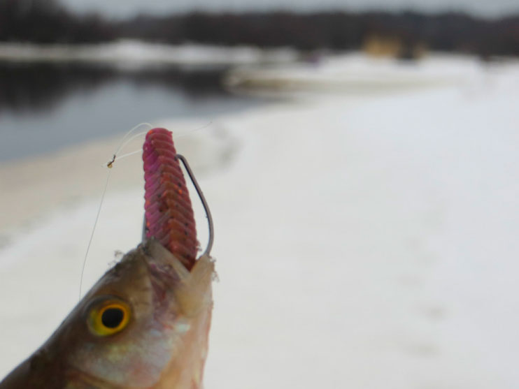 Заброс к противоположному берегу, приманка сползает, стягиваю потихоньку в яму. Затем медленный подъем. Классический тычок. Сопротивление приятное. Чувствую в сей раз нормальный окушок взял.