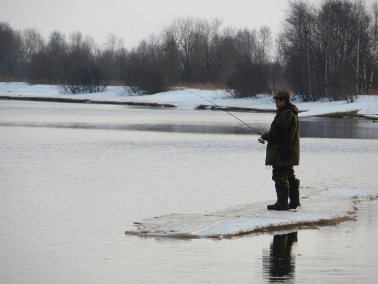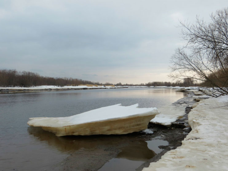 Почему то клев стихает, да и помельче стало. Наверно, окунек ближе к ямам держится. Присаживаюсь отдохнуть, да полюбоваться миром природы. Вода мощной струёй несется на убыль. Мимо пролетают оторванные льдины.