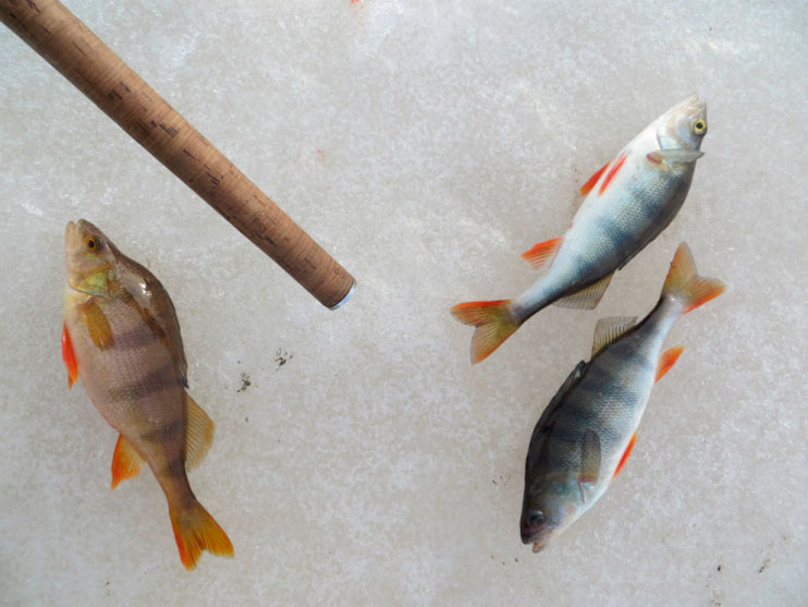 Дальше рыбалка течет своим ходом. Интересно, попадаются разноцветные окушки.