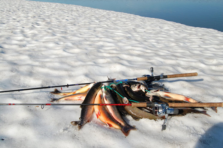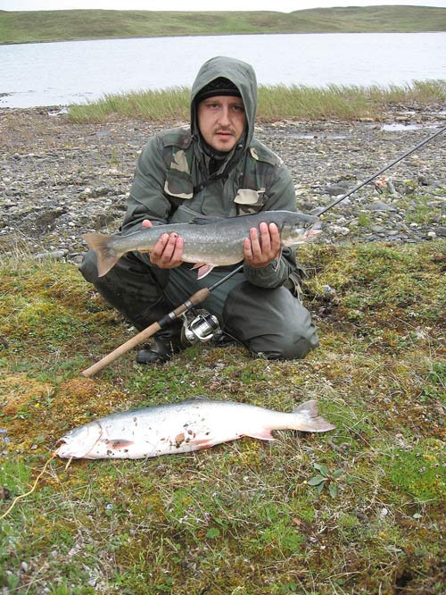 Следующий этап – ловля гольца в озёрах. Правда Арктический голец обитает и в реках - это проходной голец, но он занесён в Красную книгу и к вылову запрещён. В озёрах голец обитает около резких береговых свалов, на приличных глубинах. Лишь изредка&https://; голец выходит на мелководье, где кормится мальком,&https://; бокоплавом, насекомыми и их личинками, но эти выходы кратковременны и считайте, что Вам крупно повезло, если Вы застали рыбу, кормящуюся у поверхности воды. В прошлом году нам удалось попасть на такой выход, клёв был жадный, но скоротечный и нам&https://; удалось вывести лишь по одной – две рыбы.