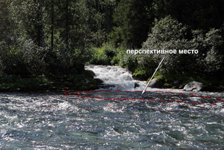 В этой точке вода с порога с большой скоростью падает в яму, образуя как бы хвост течения. По бокам ямы течение отсутствует и образуются обратки. Рыба в таких местах стоит немного сбоку такого хвоста и под струёй. Здесь образуется наиболее комфортная скорость течения для рыбы.