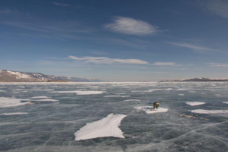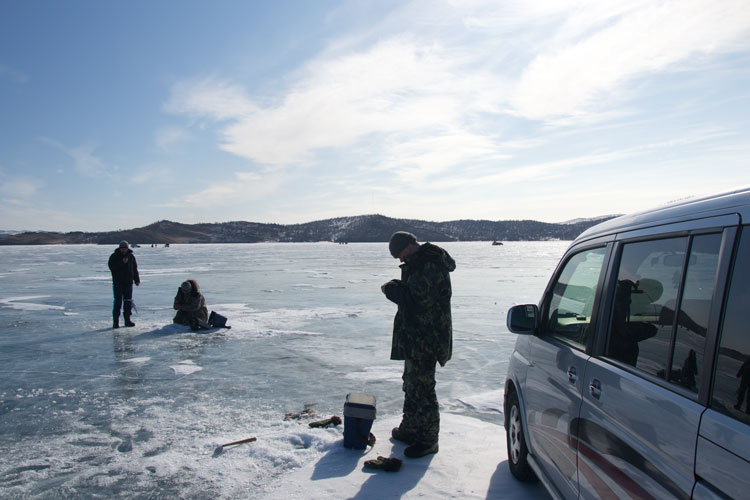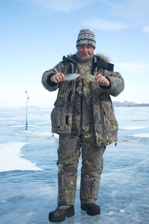 Пока переоделись, пробурили лунки, а лед на Байкале в конце марта больше 1,5 метра толщиной, и бурить обычным не спортивным буром очень нелегко :)