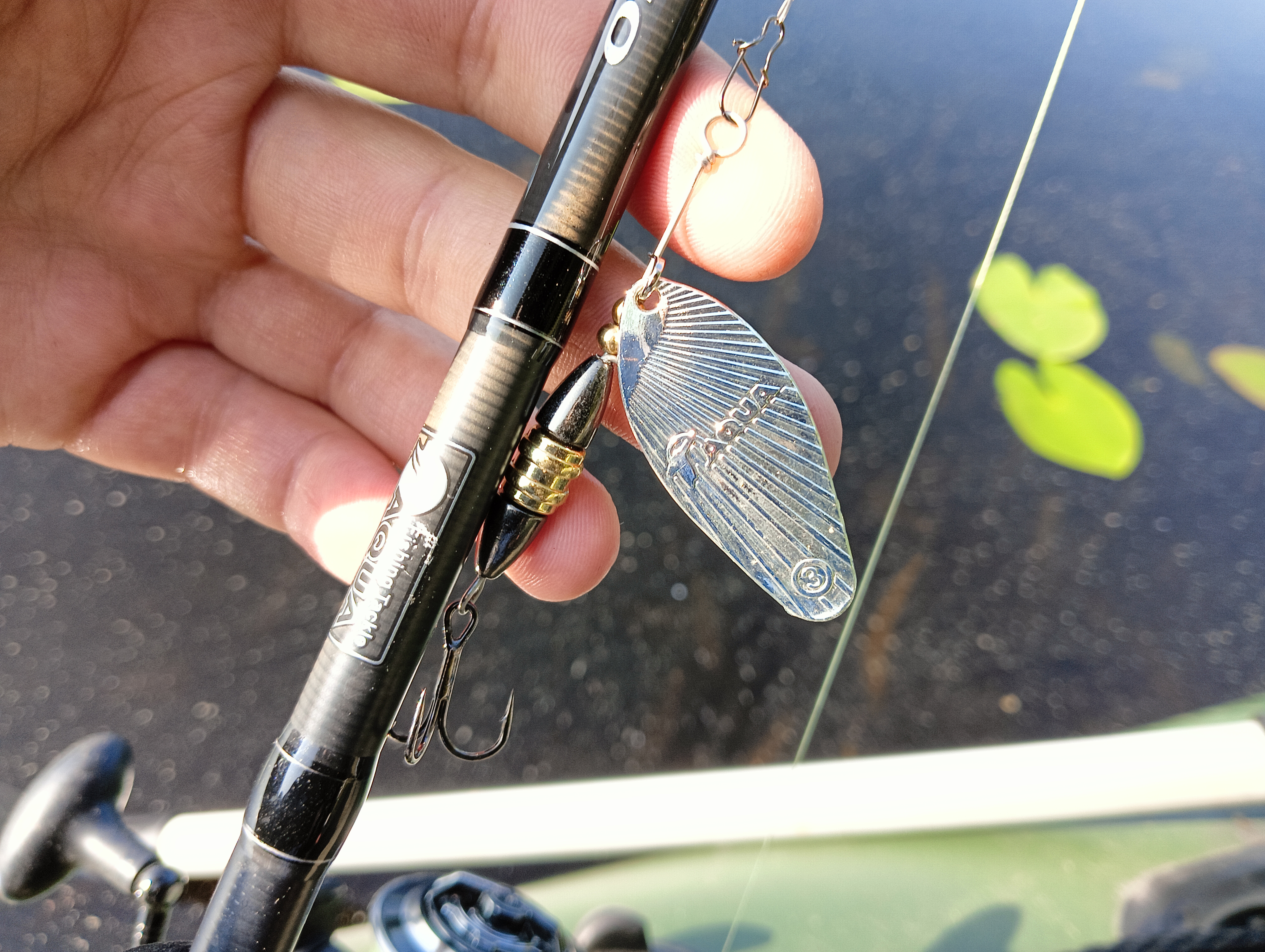 Опустил в воду вертушку — сразу понравилось, как блестит лепесток, видно будет точно издалека. Проверил вдоль лодки, как заводится — с первых мгновений проводки и на малой скорости продолжает уверенно работать.