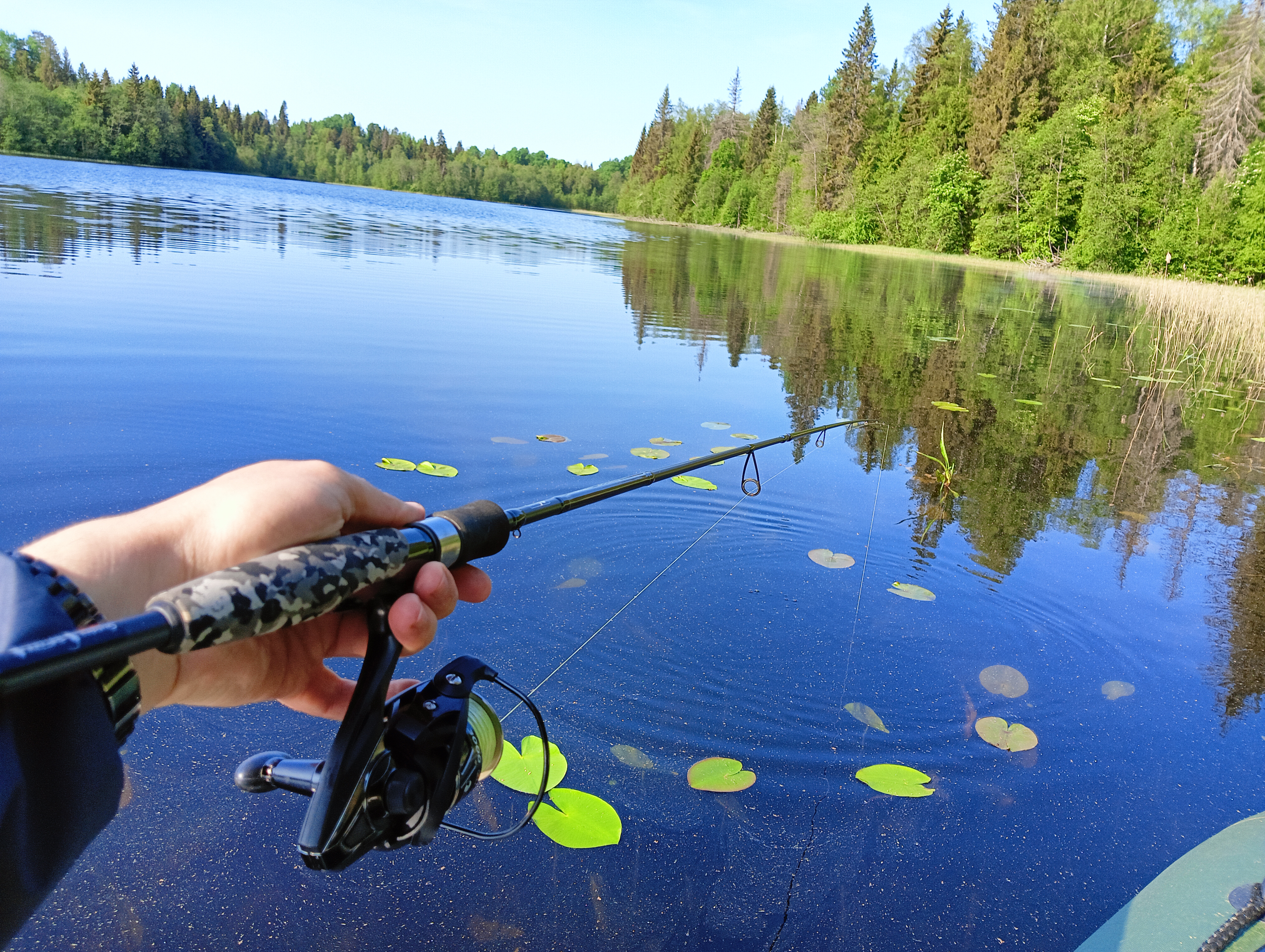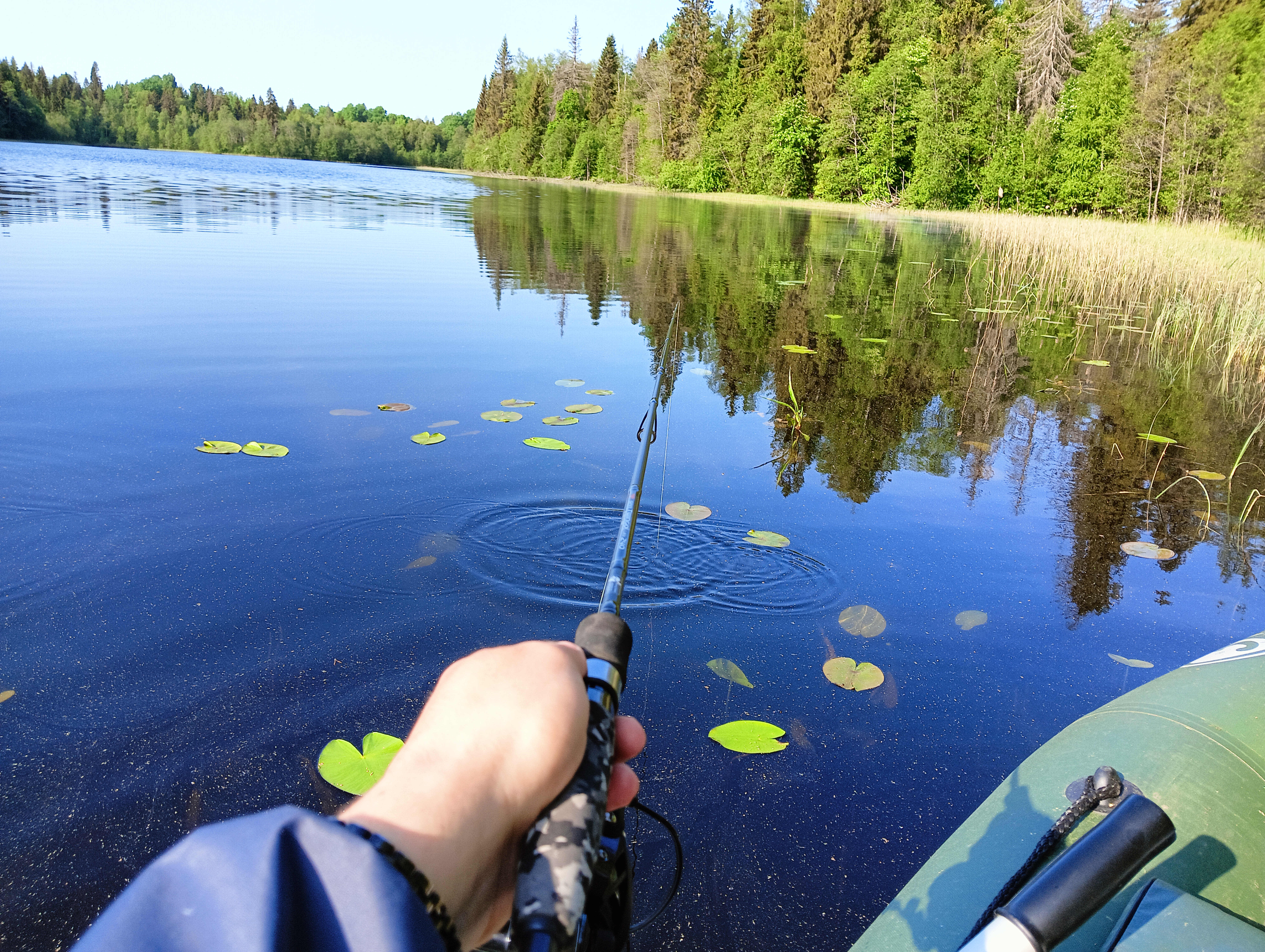 И вот я встал специально пораньше и отправился на озеро. Какими же приятными были первые в сезоне сборы и подготовка: лодку накачал при помощи компрессора и добил ножным насосом, как обычно, с трудом вставил сидения, разобрал спиннинг. И вот уже отталкиваюсь, и я на воде, а вокруг красота, и на душе радость.