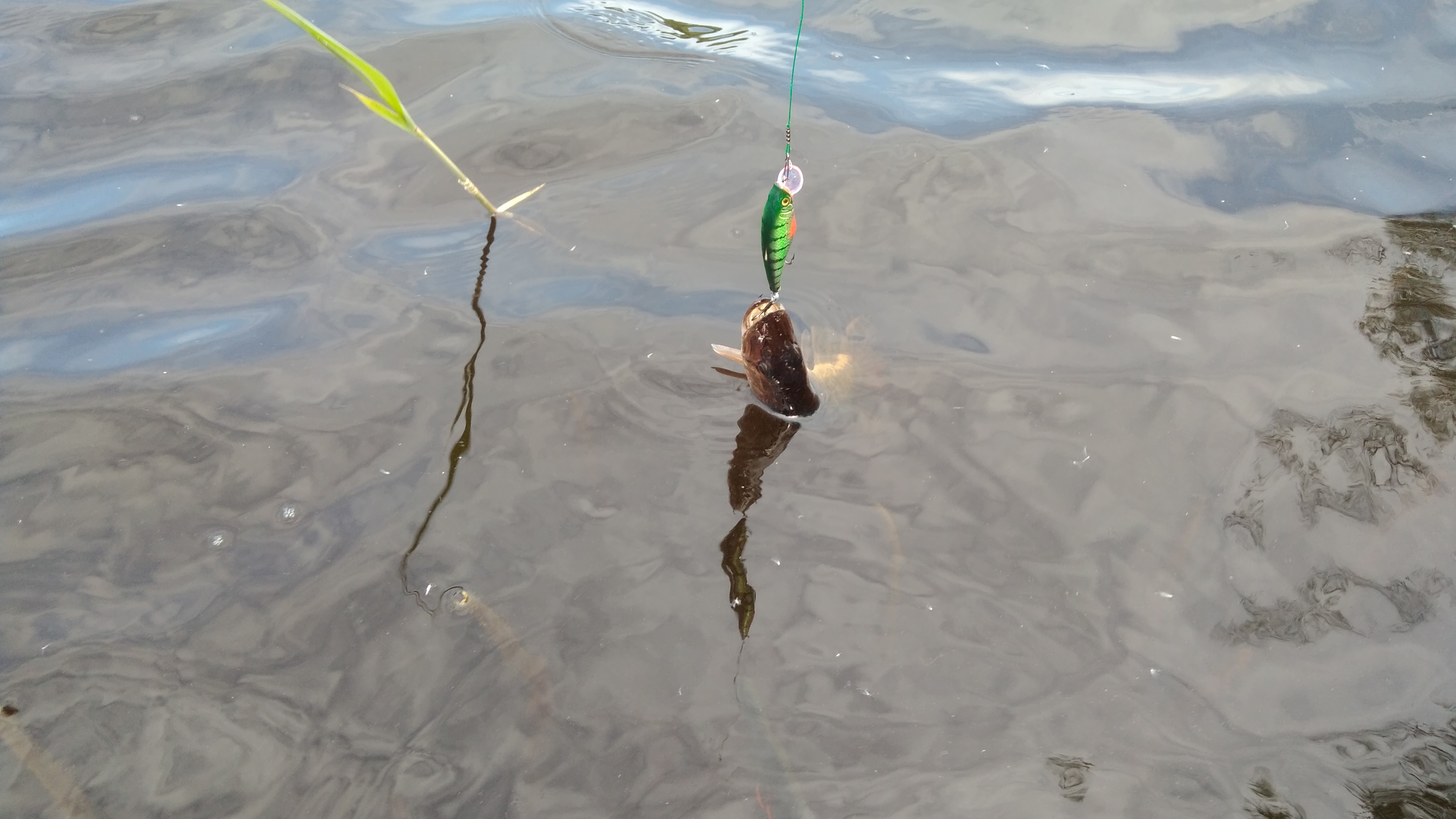 Попытки стряхнуть в воде не закончились успехом, поэтому пришлось его взять в руки чтобы освободить от острых крючков и отпустить обратно, набираться веса для будущих возможных поимок. Жена же в свою очередь оценила данный воблер, заприметила его в свою коробочку со снастями, чему я собственно не против!
