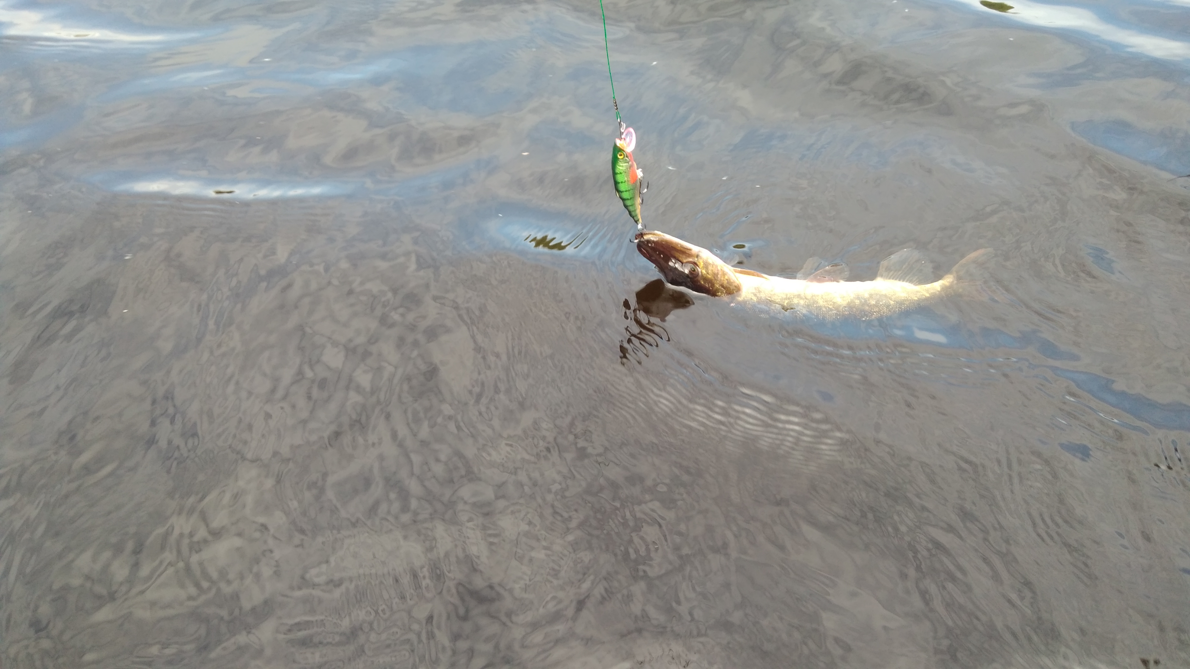 На очередном забросе воблер ложится на лист кувшинки, я его стаскиваю, получается достаточно агрессивно, с брызгами, и мгновенно происходит поклёвка – снова небольшой щурёнок, который схватил тройник уже гораздо увереннее чем первый.