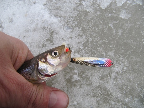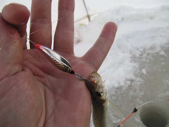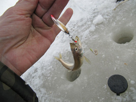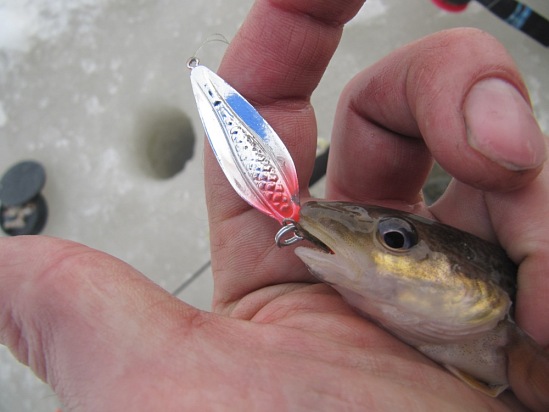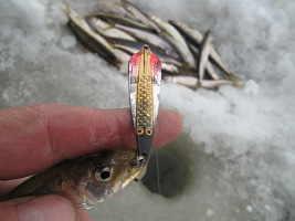 Да и с другой стороны, вялая рыба, чаще реагирует на вновь появляющиеся раздражители. Поднял блёсны. Стоит одна прикормка, рыбка подошла, потихоньку кормится. Вернулся в палатку. Первую уду запусти. Рыба сразу реагирует и атакует блесну. Половил, клёв ослаб, можно следующую запускать. Рыба, привыкшая к первой блесне, интересуется новинкой. Подходит и, как правило, делает атаку. Тут не зевай, подсекай.