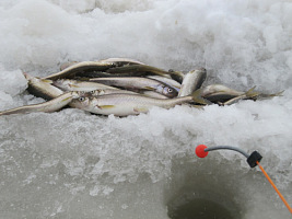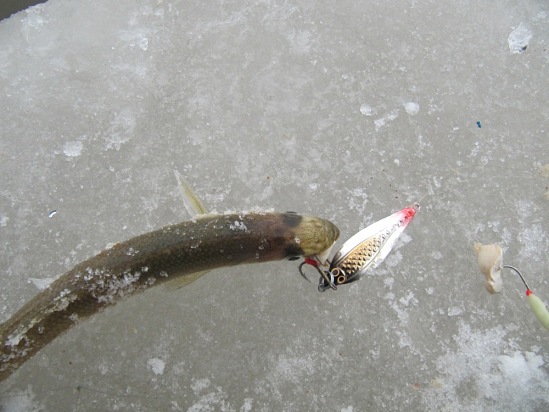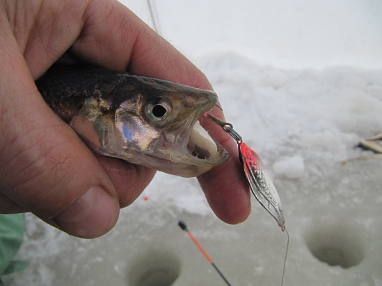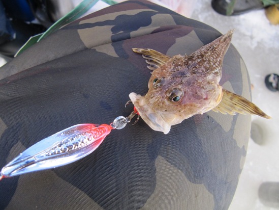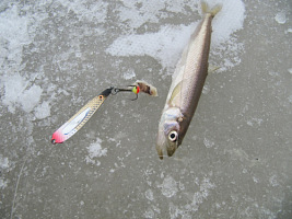 Рыбалка развивается своим чередом. Рыбка периодически поклёвывает на зимние блёсенки. При, чем «Блик» и «Гюрза» явно лидируют. Примерно 1:5 оставляя в проигрыше «Онегу». В отличие от хариуса, морской рыбе больше нравились блесны с широким захватом воды, они больше играют на течении, парят. Хариус же предпочитал менее подвижные блёсны, типа «Онеги». Интересный вывод получился, раньше не предполагал, что это так.