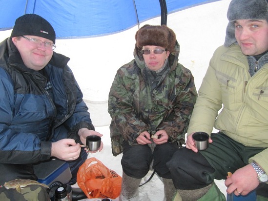 Около одиннадцати часов ребята пришли на первый завтрак. Без палатки на ветру чуток задубели. Теперь отогреваются у меня. Смотрят, на какие блёсенки клюёт, как прикормка устроена. Проводим практические занятия за чашкой чая. Показываю, как можно сыграть блёсенкой, как замедлить падение на опускании, либо подыграть будто мормышкой.