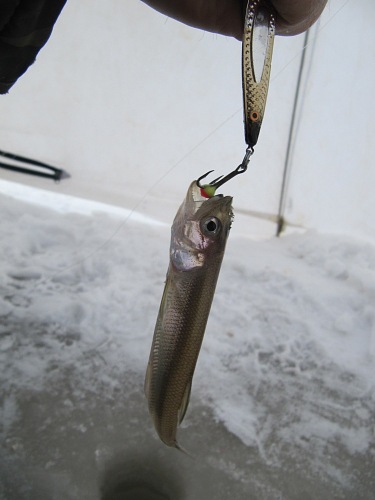 Отошла. Краем глаза заметил слева шевеление. Подсекаю. Корюшок на «Шнягу»