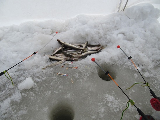 Если ухожу куда из палатки, удочки обязательно поднимаю под лёд. Иначе оставишь, попадётся рыбка, сделает кружок вокруг лунки и соберет в кучу все уды, блесны, да и прикормку. Выпутывать потом трудно и долго. До получаса потеряешь, то и больше. Поэтому не ленюсь и лучше уды поднять.