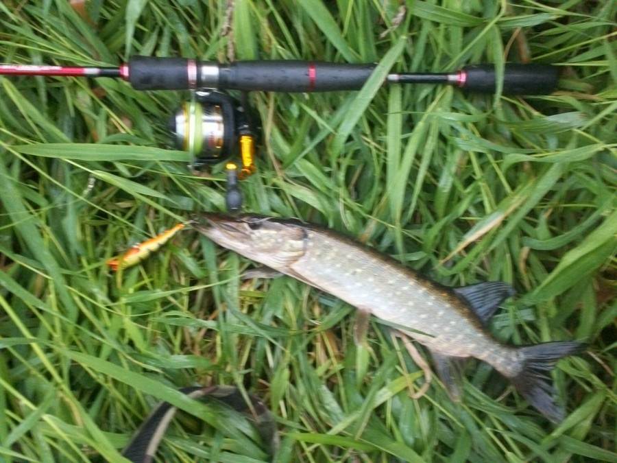 Лезу в карман жилета за коробкой. Не знаю - почему, взгляд падает на кроху "Бит", кренк всего-то 4 см длиной и 2.5 гр весом. Ставлю его. С первого-же заброса - жёсткая хватка! И пошло то, ради чего и лазаешь по кустам и траве - свечки, попытки уйти в траву... Щучка не крупная, но ужасно бойкая, она всегда такая в этой речке. Наконец подруга в руках: