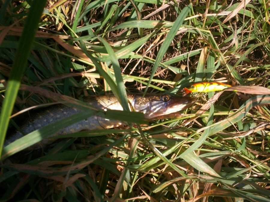 Место проверенное, щука здесь обязана стоять. Раз за разом швыряю "махновца", как я его для себя назвал. Резкие рывочки, недлинные паузы... Есть! Не выдершали нервишки у щупака, Решил-таки укусить наглеца, нарушившего его территорию. Борьба недолга - щучка пляшет на берегу: