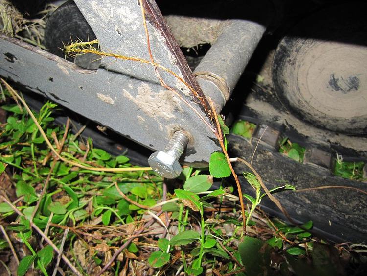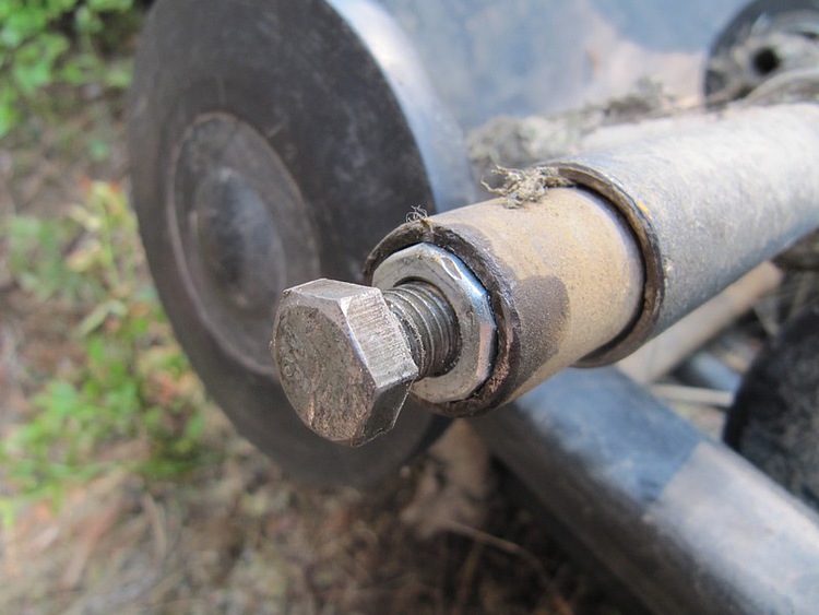 Выкручиваем короткий родной болт из шайбы. Забиваем шайбу обратно в ось тележки и ставим пятисантиметровый. Теперь, если и вырвет вновь шайбу, тележка на болте, как на консоли будет держаться.