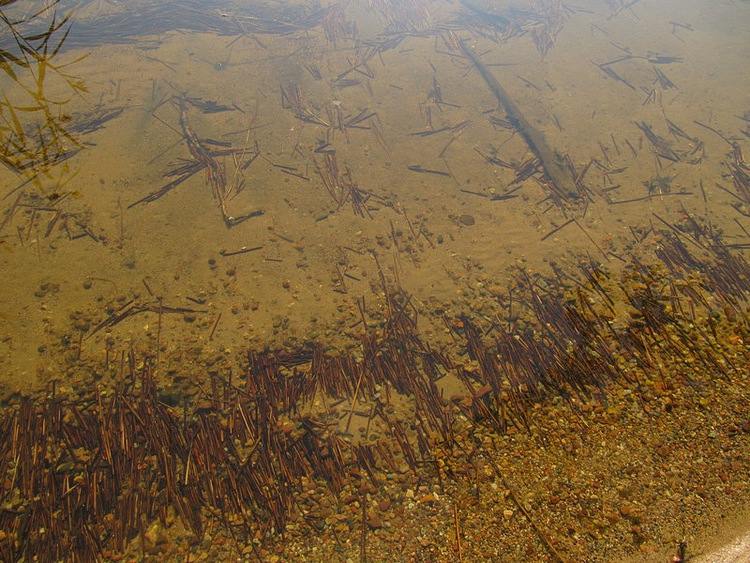 Вышел к щучьей травке. Тонкие вытянутые листья, похожие на ивовые, красного цвета полянкой примостились у края тресты. Начинаю обстрел по краю. Поклевок нет. Так от безделья и невостребованности моего рыбацкого азарту наблюдаю за окушками и плотвичками, бегущими стайками за блёсенкой. Много их вокруг меня собралось. Мути ногами наподнимал. Стая живцового размера разгуливает, будто стоишь в аквариуме и рыбы вокруг тебя плавают.