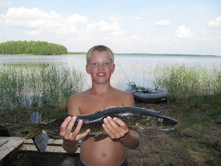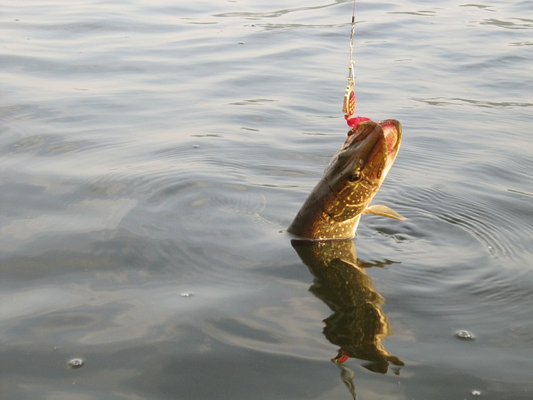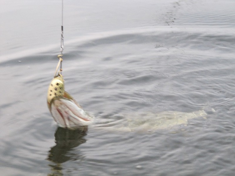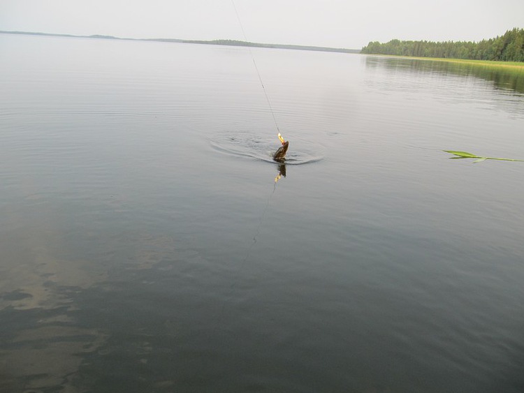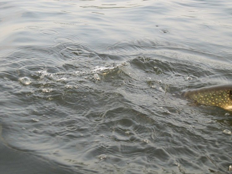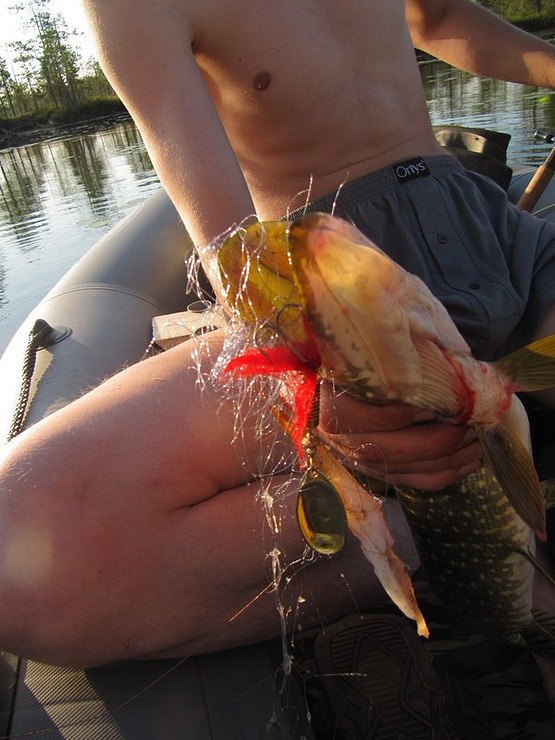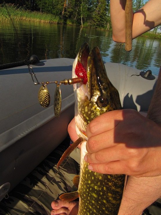 Славик подводит к борту и я за спину перекидываю щучку в лодку.