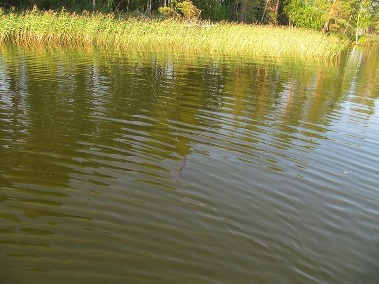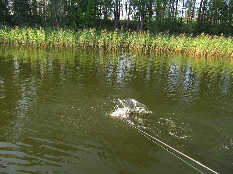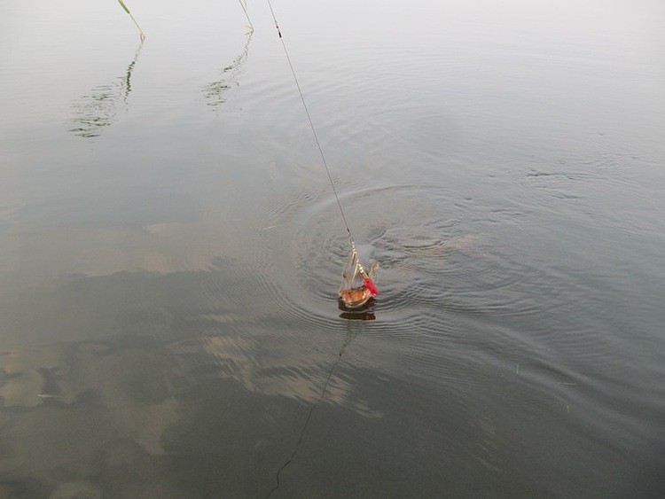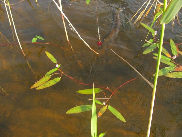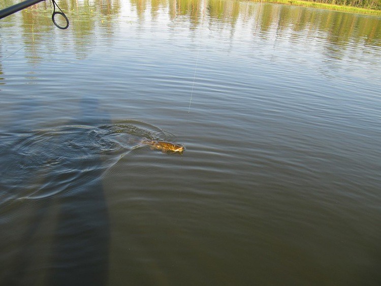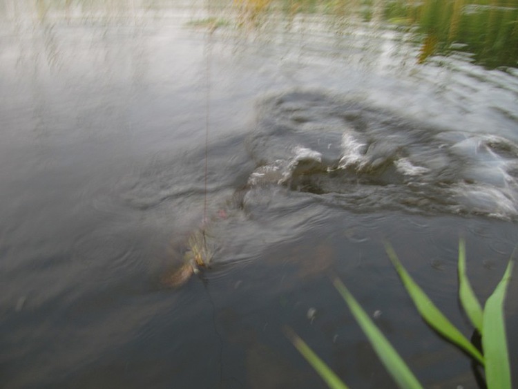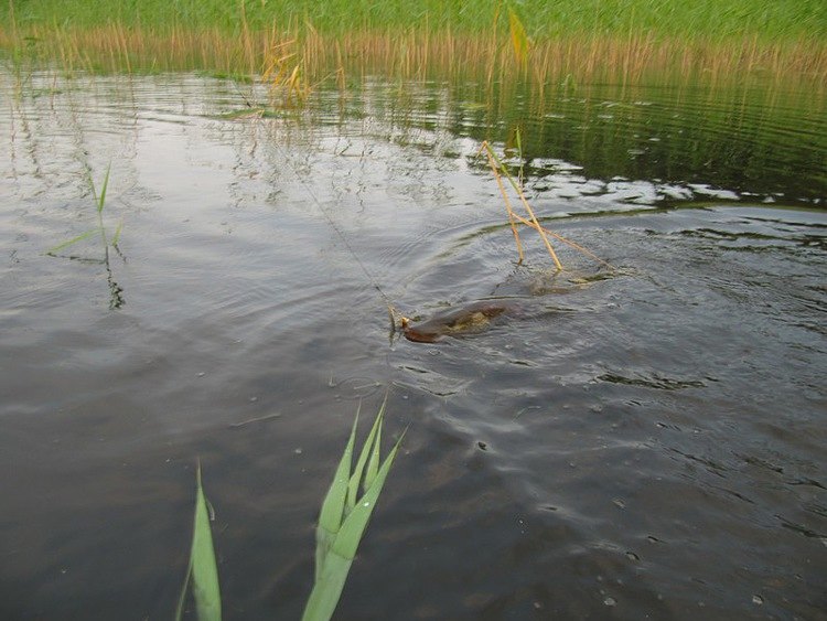 Спокойно забираю рукой за спину у головы и через тресту выношу на берег